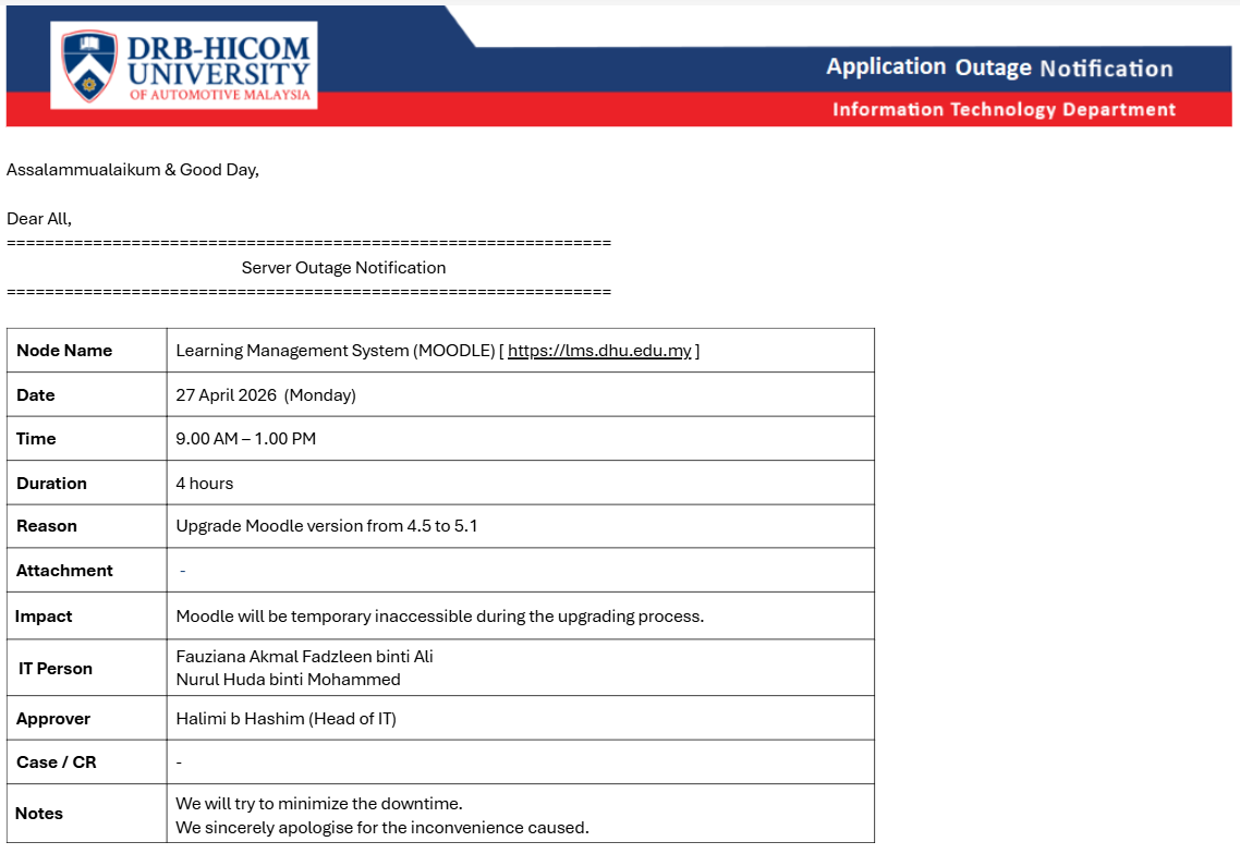 Please be informed that the Moodle platform will be temporarily unavailable due to a scheduled system upgrade. Details are as follows: